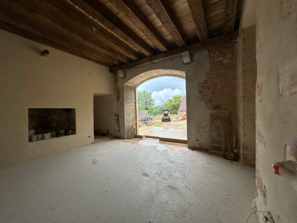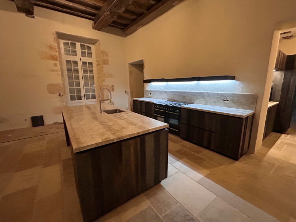 chais encore intacts, dissimulent à peine une piscine trapézoïdale d’un bleu cinglant.